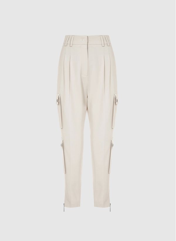 Confeccionada em tecido plano, a Calça possui modelagem alfaiataria, caimento solto, cós aplicado, pregas frontais, bolsos laterais, frontais e posteriores, aberturas laterais por zíper e acabamento pespontado.