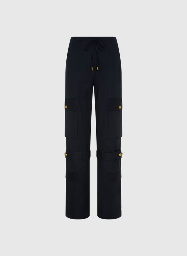 A Calça é confeccionada em algodão piquet, possui modelagem em alfaiataria, caimento reto, modelo cargo, cós com aplicação de elástico, dois bolsos frontais modelo faca, dois bolsos amplos nas laterais com lapelas, lapelas decorativas nas laterais, dois bolsos posteriores com lapelas, aplicação de cordão para amarração frontal e acabamento pespontado.