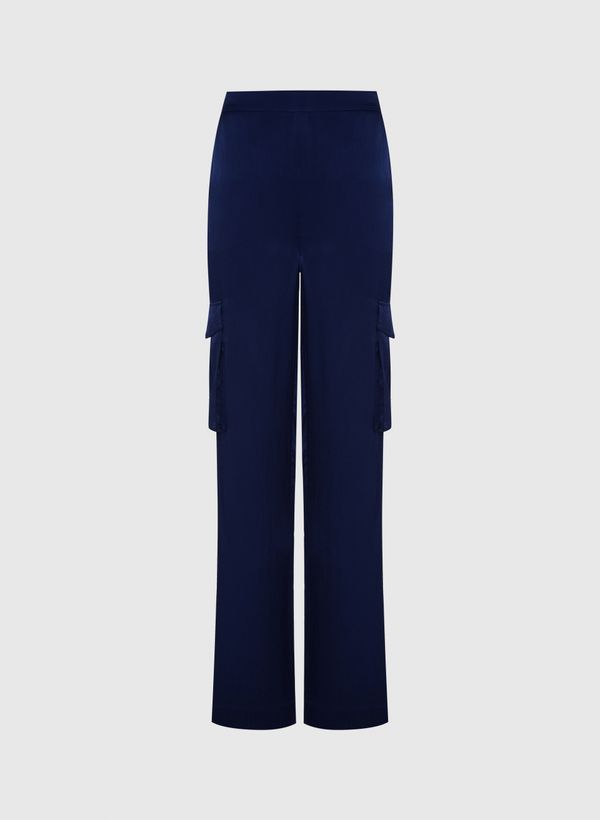 A Calça é confeccionada em viscose, possui caimento reto, modelo cargo, cós aplicado com elástico posterior, dois bolsos frontais modelo faca, dois bolsos laterais amplos com lapelas, fechamento lateral por zíper invisível e acabamento pespontado.
