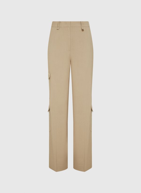 A Calça é confeccionada em crepe twill, possui modelagem em alfaiataria, modelo cargo, cós com passantes, dois bolsos modelo faca, dois bolsos amplos com lapelas, dois bolsos posteriores com lapelas, detalhe do pingente com logo da marca no passante, fechamento frontal por zíper e acabamento pespontado.