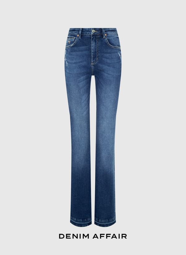 A Calça é confeccionada em jeans com lavagem média, possui modelagem bootcut, cós com passantes, dois bolsos frontais tipo faca, um bolso relógio com bordado, dois bolsos traseiros com filigrana de cobra, detalhes em destroyed, fechamento frontal por botão e zíper e acabamento pespontado.
