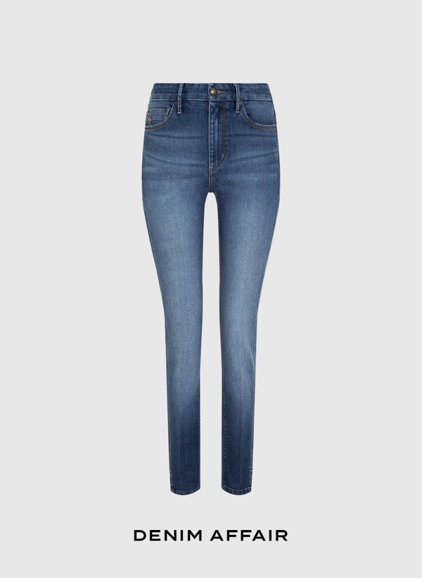 A Calça é confeccionada em jeans, possui lavagem média, modelagem skinny, cós com passantes, dois bolsos frontais tipo faca, um bolso relógio com bordado, dois bolsos traseiros com filigrana de cobra, fechamento frontal por zíper e botão e acabamento pespontado.