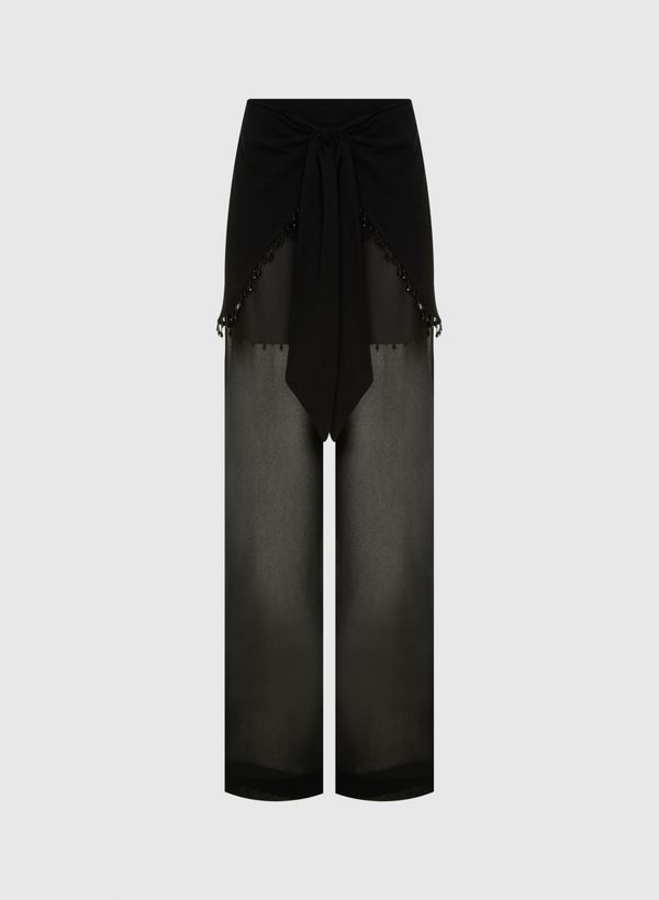 A Calça é confeccionada em georgette de viscose, possui transparência, cós embutido, detalhe frontal de sobreposição com amarração, aplicação de franja de vidrilho manual e fechamento lateral por zíper invisível.