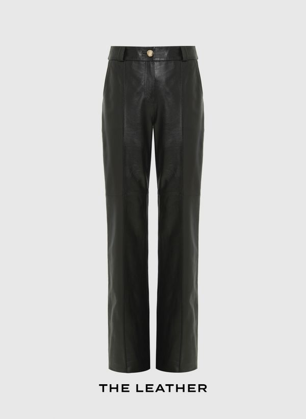 A Calça é confeccionada em couro, possui caimento reto, cós com passantes, dois bolsos frontais tipo faca, dois bolsos posteriores embutidos com lapelas, fechamento frontal por zíper e botão e acabamento pespontado.