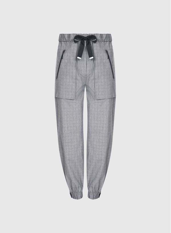 A Calça é confeccionada em tecido plano com padronagem xadrez, possui modelagem alfaiataria, modelo cargo, cós aplicado com elástico e cordão para amarração, dois bolsos frontais sobrepostos com fechamento por zíper, dois bolsos posteriores, barra com elástico e acabamento pespontado.
