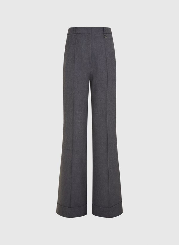 A Calça é confeccionada em tecido plano, possui modelagem em alfaiataria, caimento reto, cós com passantes e detalhe de pingente aplicado, dois bolsos frontais tipo faca, dois bolsos posteriores embutidos, fechamento frontal por zíper e colchete e acabamento pespontado.