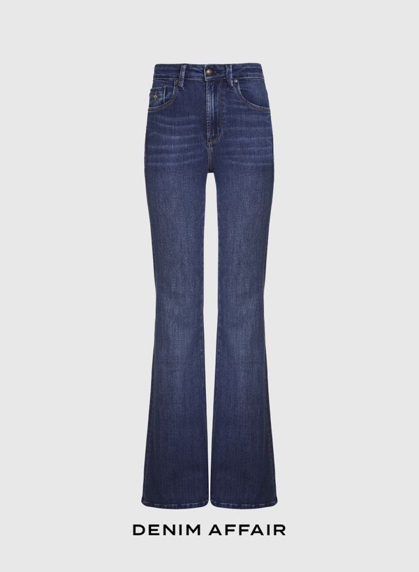 A Calça é confeccionada em jeans, possui lavagem escura, modelagem flare, cós com passantes, dois bolsos frontais tipo faca, um bolso relógio com bordado, dois bolsos traseiros com filigrana de cobra, fechamento frontal por botão e zíper e acabamento pespontado.