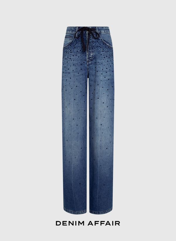 A Calça é confeccionada em jeans, possui lavagem média, possui caimento reto, cós com passantes, dois bolsos frontais tipo faca, um bolso relógio, dois bolsos traseiros com filigrana de cobra, pedrarias aplicadas, fechamento frontal por zíper e botão, cordão para amarração e acabamento pespontado.