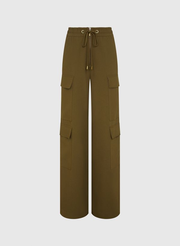 A Calça é confeccionada em tecido plano, possui modelagem em alfaiataria, cós aplicado, dois bolsos tipo faca, quatro bolsos amplos com lapelas, dois bolsos posteriores embutidos, fechamento frontal por zíper e cordão para amarração.