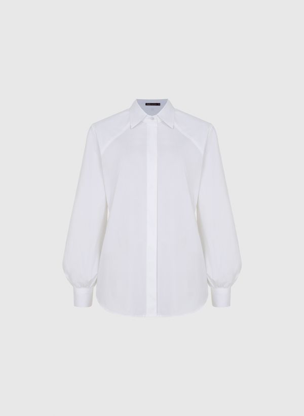 Confeccionada em tricoline, a Camisa possui modelagem reta, gola com colarinho, fechamento frontal por botões com vista sobreposta, mangas longas bufantes com abotoamento duplo nos punhos e detalhe de logo bordado, detalhe posterior de prega, barra arredondada e acabamento pespontado.
