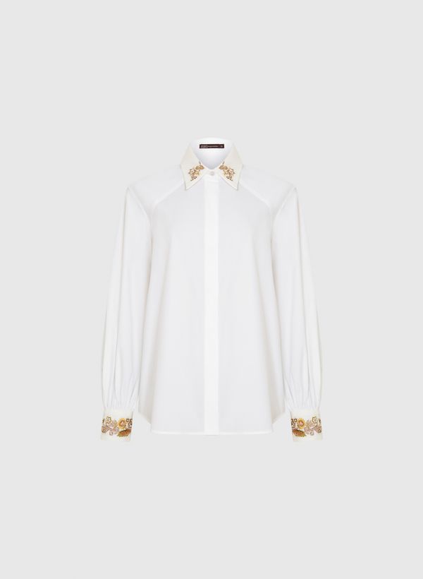A Camisa é confeccionada em tricoline de algodão, possui gola bordada com colarinho, mangas longas com abotoamento nos punhos, aplicação de bordado manual na gola e nos punhos, fechamento frontal por botões e vista sobreposta com acabamento pespontado.