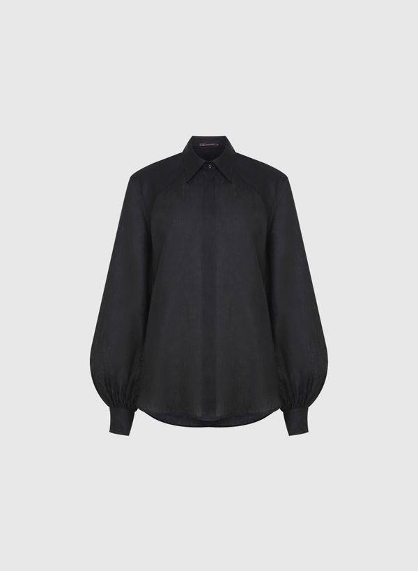 A Camisa é confeccionada em linho, possui caimento reto, gola com colarinho, mangas longas bufantes com abotoamento nos punhos, fechamento frontal por botões e acabamento pespontado.