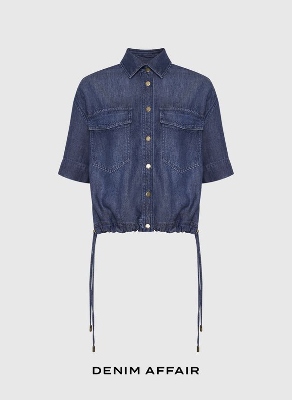 A Camisa é confeccionada em jeans, possui lavagem média, gola com colarinho, mangas curtas, dois bolsos frontais com lapelas, barra com amarração regulável, fechamento frontal por botões e acabamento pespontado.