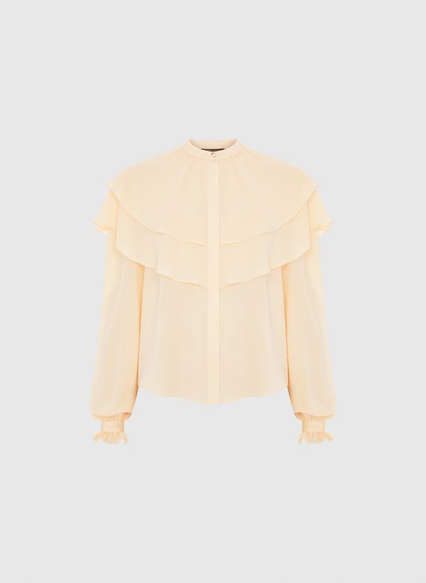 A Camisa é confeccionada em seda, possui gola careca, mangas longas com punhos franzidos e fechamento por botão, duas camadas de babados amplos sobre o busto e nas costas, fechamento frontal por botão e acabamento pespontado.