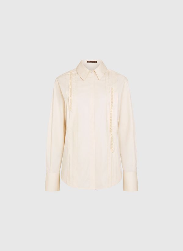 A Camisa é confeccionada em tricoline, possui gola com colarinho, mangas longas com abotoamento nos punhos, tape de tricoline, pérolas aplicadas, fechamento frontal por botões e vista sobreposta, barra arredondada e acabamento pespontado.