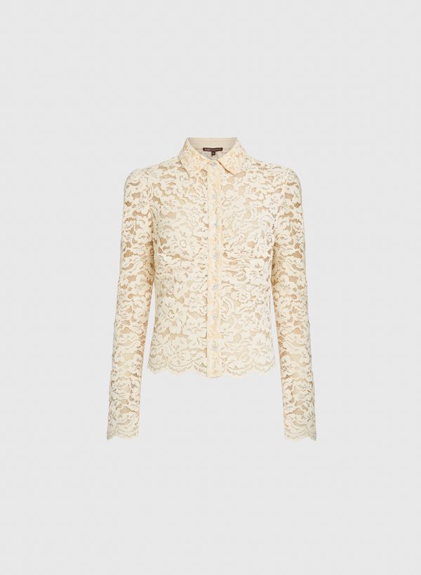 A Camisa é confeccionada em renda flocada floral de veludo, possui modelagem ajustada ao corpo, gola com colarinho, mangas longas, fechamento frontal por botões e acabamento refinado.