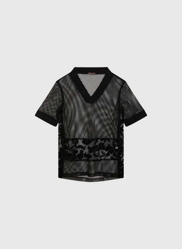 A Camiseta é confeccionada em renda, possui transparência, modelagem reta, decote em "V", mangas curtas, detalhe em renda e acabamento pespontado.