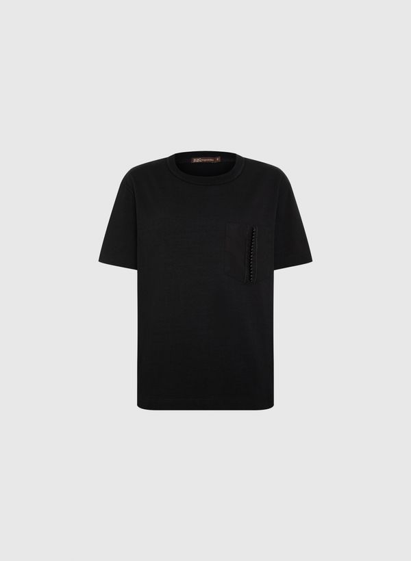 A Camiseta é confeccionada em malha, possui modelagem levemente solta, decote redondo, bolso frontal com pérolas aplicadas, mangas curtas e acabamento pespontado.