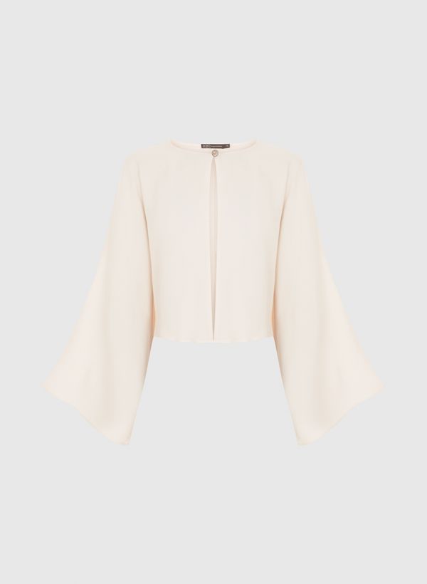 A Capa é confeccionada em crepe moss, possui decote redondo, mangas longas amplas, fechamento superior com botão decorativo e acabamento pespontado.