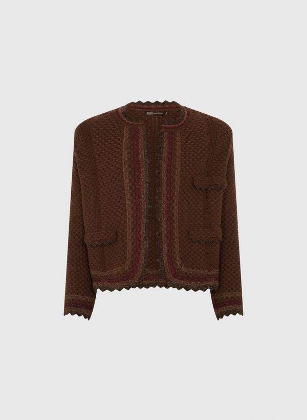 O Cardigan é confeccionado em tricot texturizado com fios lurex, possui modelagem reta, decote redondo, abertura frontal, três bolsos frontais aplicados com lapelas, mangas 7/8, ombreiras removíveis e acabamento ondulado.