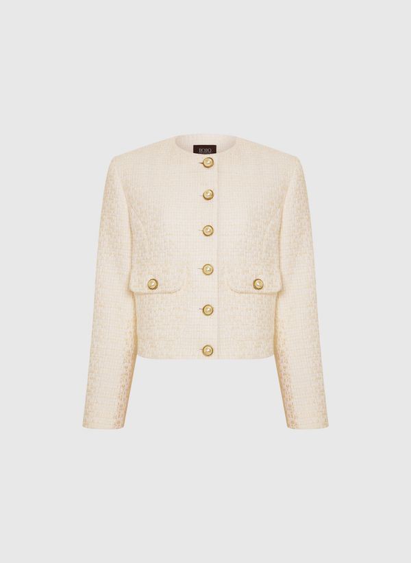 O Casaco é confeccionado em tweed, possui decote redondo, mangas longas com abotoamento nos punhos, bolsos frontais com lapelas e pérolas aplicadas, fechamento frontal por botões com pérolas e acabamento refinado.