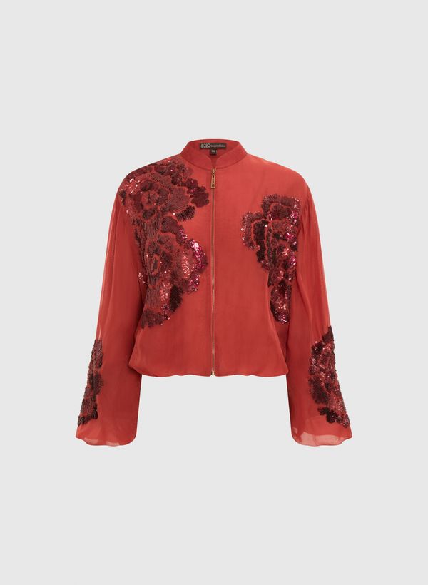 O Casaco é confeccionado em nylon, possui transparência, detalhes em bordado floral com paetês, modelo bomber, gola média, mangas longas bufantes, elástico na barra, fechamento frontal por zíper e acabamento pespontado.