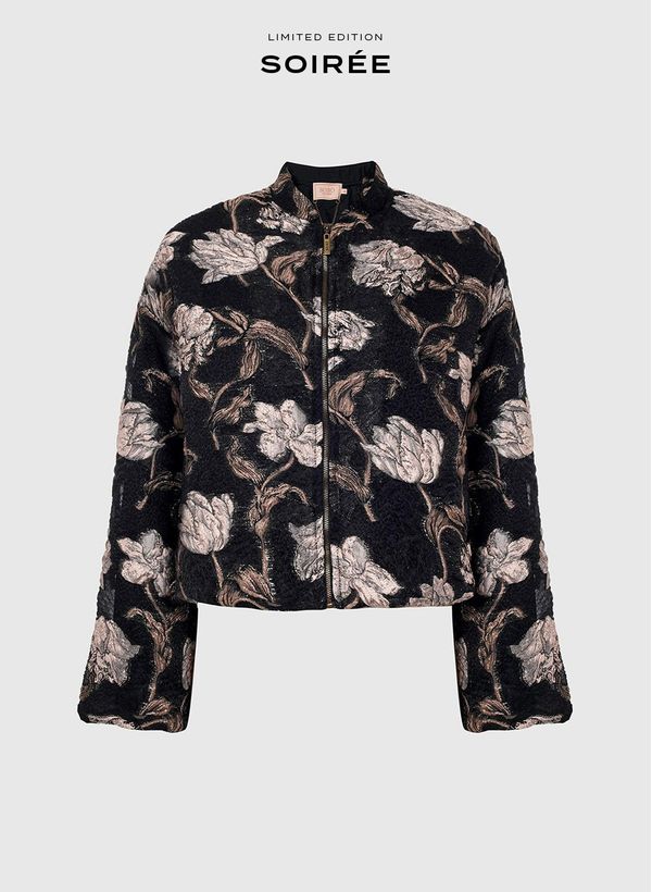 Confeccionado em jacquard com fios de lurex, o Casaco possui padronagem floral em relevo, modelo bomber, caimento reto, fechamento frontal por zíper, mangas longas, forro embutido, comprimento curto e acabamento embutido.