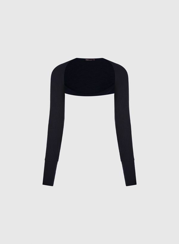 O Casaco é confeccionado em tricot, possui caimento ajustado ao corpo, mangas longas, comprimento curto e acabamento canelado.