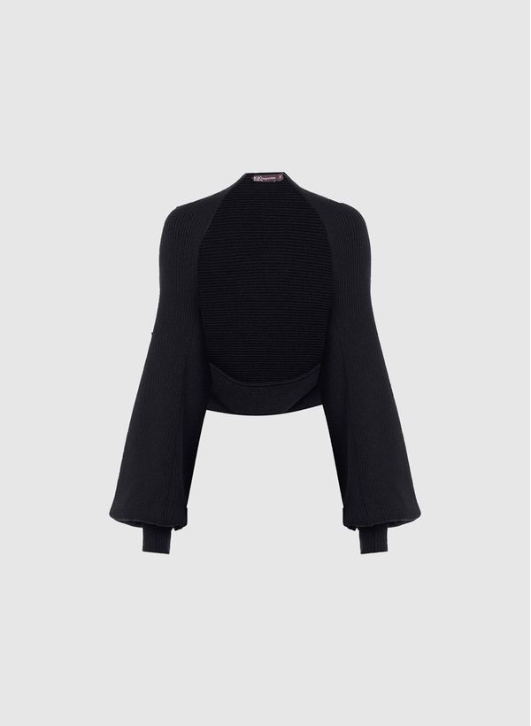O Casaco é confeccionado em tricot canelado, possui efeito shape amplo, mangas longas levemente bufantes e não possui fechamento.