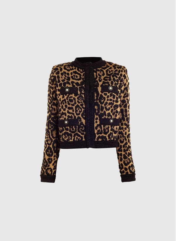 Confeccionado em tricot com padronagem animal print, o Casaco possui modelagem reta, gola média, mangas longas, fechamento frontal por botões, quatro bolsos frontais e comprimento cropped.