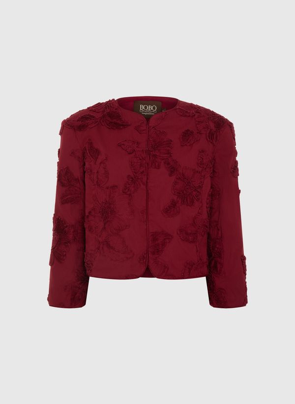 O Casaco é confeccionado em algodão bordado com flores feitas do próprio tecido, possui decote redondo, mangas 7/8 e fechamento frontal por colchetes.