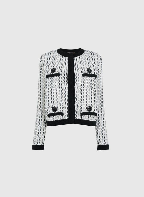 Confeccionado em tricot, o Casaco possui modelo casaqueto, modelagem reta, gola redonda, mangas longas, detalhes na cor preta, fechamento frontal por botões, quatro bolsos frontais e broche preso à peça.
