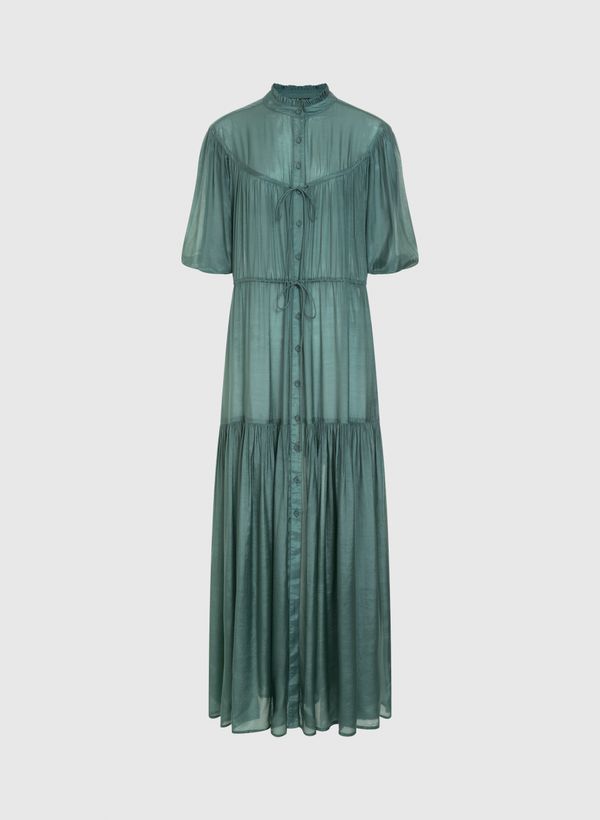 A Chemise é confeccionada em tecido plano, possui transparência, caimento reto, gola média, mangas curtas bufantes, detalhes franzidos, cordão aplicado, fechamento frontal por botões, comprimento midi e acabamento pespontado.