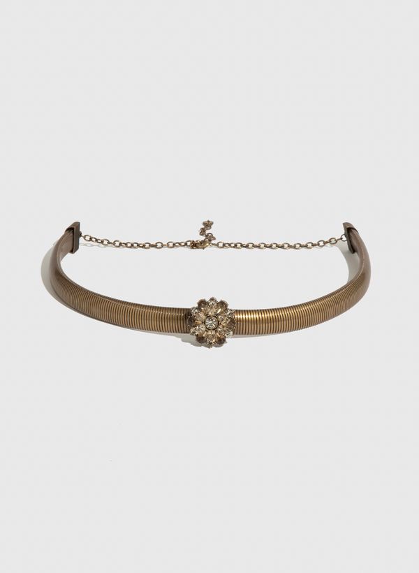O Cinto é confeccionado em mola de metal, possui espessura média, aplicação de flor com cristais multifacetados surtom e fechamento por gancho.