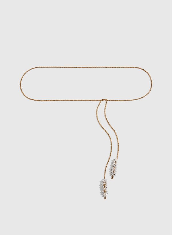 O Cinto é produzido por metal, possui banho dourado, espessura fina, detalhes perolados nas pontas e fechamento por amarração.