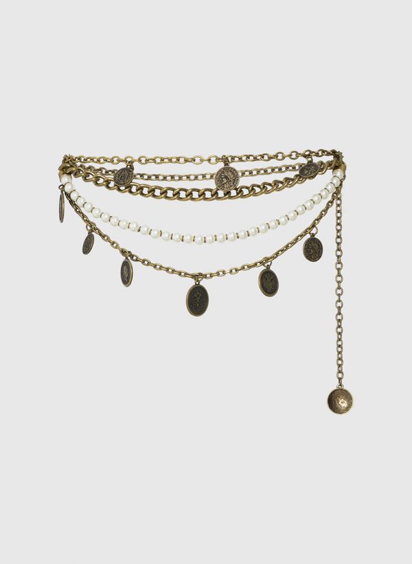O Cinto é confeccionado em metal, possui banho ouro velho, quatro correntes frontais com medalhas e pérolas e fechamento por mosquetão de metal.