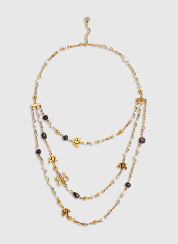 O Colar é confeccionado em zinco e cobre, possui banho ouro vintage, alta cobertura com milésimos de ouro, corrente com três voltas, aplicação de pérolas negras e off white barrocas, cristais, esferas marteladas e mini lótus em metal, e fechamento por gancho.