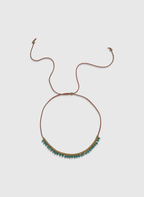O Colar é confeccionado em metal com banho dourado, possui cordão em camurça, espessura fina, miçangas aplicadas e fechamento regulável.