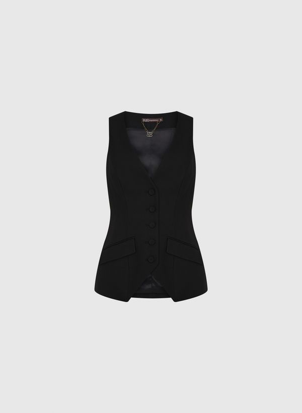 O Colete é confeccionado em crepe twill, possui modelagem em alfaiataria, decote em "V", alças largas, detalhe de anca nas laterais, lapelas frontais decorativas, forro interno, fechamento frontal por botões e acabamento pespontado.