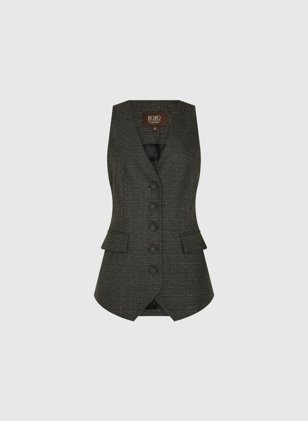 O Colete é confeccionado em tecido plano, possui modelagem em alfaiataria, decote em "V", alças médias, dois bolsos embutidos com lapelas, cinto com regulagem posterior, fechamento frontal por botões e acabamento pespontado.