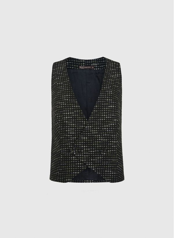 O Colete é confeccionado em tweed, possui modelagem alfaiataria, alças largas, fechamento frontal por botões revestidos, cava com recorte vazado posterior, forro embutido e acabamento pespontado.