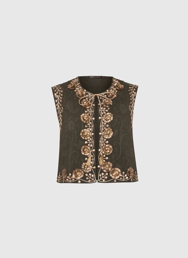 O Colete é confeccionado em tecido plano com padronagem jacquard, possui bordado manual floral e linha com paetês metálicos, decote redondo, alças largas, fechamento frontal por tiras no decote e ponteiras de tassels.