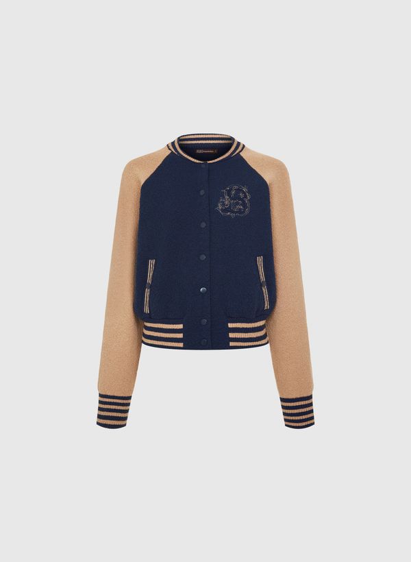 A Jaqueta é confeccionada em tricot, possui modelagem bomber, gola semi alta canelada, detalhe frontal de logo bordado com fios de lurex, mangas longas com punhos canelados, dois bolsos frontais com fechamento por botão, barra canelada, forro interno, comprimento curto, fechamento frontal por botões de pressão revestidos e acabamento canelado com detalhe bicolor.