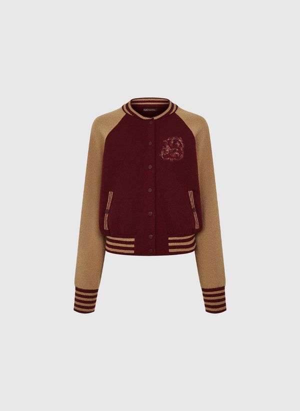 A Jaqueta é confeccionada em tricot, possui modelagem bomber, gola semi alta canelada, detalhe frontal de logo bordado com fios de lurex, mangas longas com punhos canelados, dois bolsos frontais com fechamento por botão, barra canelada, forro interno, comprimento curto, fechamento frontal por botões de pressão revestidos e acabamento canelado com detalhe bicolor.