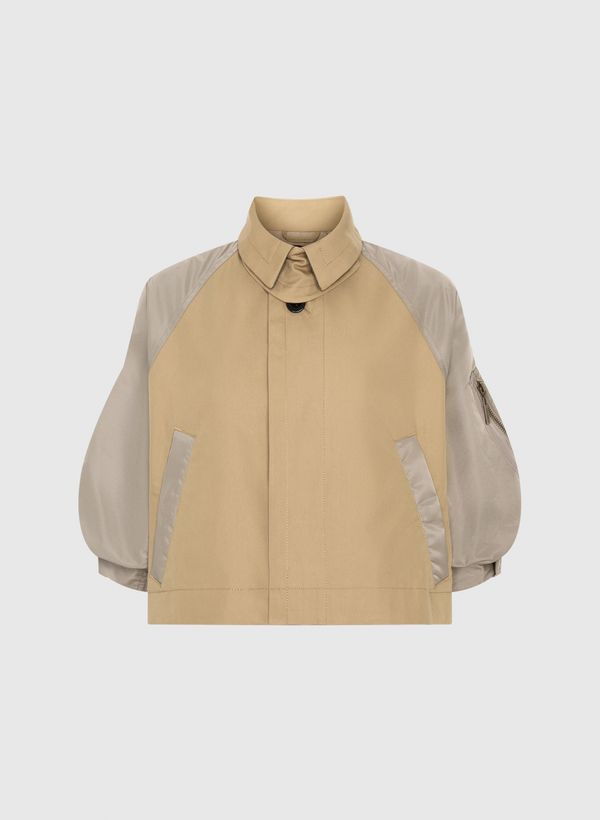 A Jaqueta é confeccionada em tecido plano e nylon, possui modelagem em alfaiataria, gola com colarinho e lapela com fechamento por botão, mangas 3/4 com detalhes franzidos, dois bolsos frontais tipo faca e um bolso na manga com fechamento por zíper, fechamento frontal por botões e acabamento pespontado.
