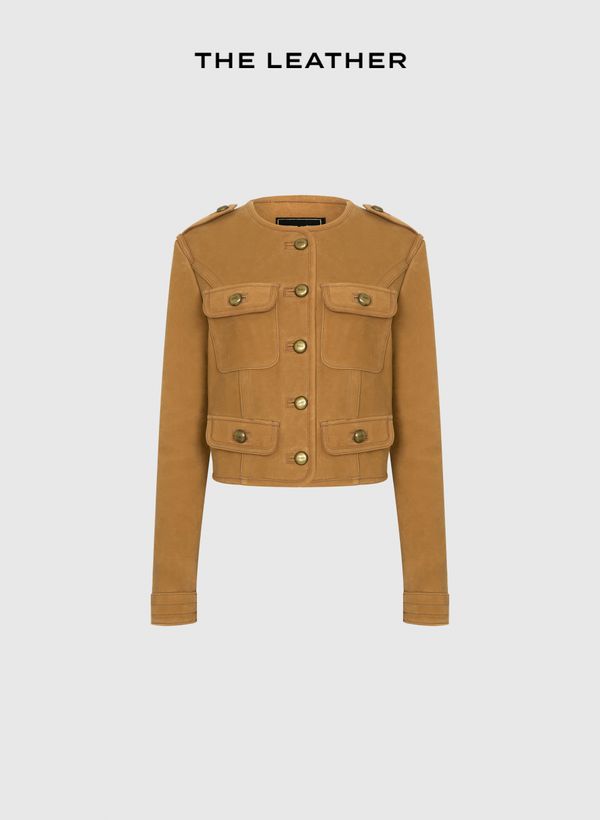A Jaqueta é confeccionada em couro com acabamento nobuck, possui caimento reto, gola redonda, detalhe de martingales nos ombros, fechamento frontal por botões, dois bolsos frontais com abotoamento, detalhe de duas lapelas com botões, possui forro interno, mangas longas, comprimento curto e acabamento em pesponto.