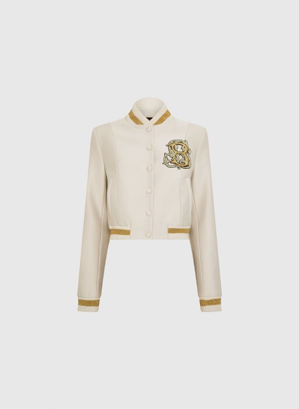 A Jaqueta é confeccionada em moletom, possui modelagem reta, gola semi alta canelada, fechamento frontal por botões de pressão revestidos, mangas longas com punhos canelados, detalhe frontal de logo bordado com pedrarias, dois bolsos frontais, barra com detalhe canelado, forro interno comprimento curto.