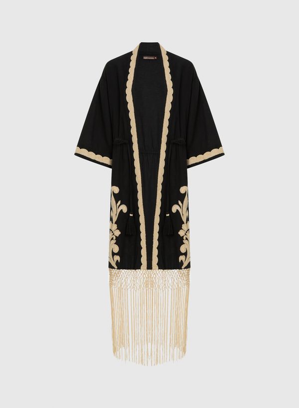 O Kimono é confeccionado em tecido plano, possui bordado manual texturizado em contraste com padronagem floral e aplicações de miçangas, mangas 3/4, aplicação de franjas alongadas em macramê, fechamento frontal por amarração com cordão ajustável e ponteiras com tassels, comprimento curto e acabamento pespontado.