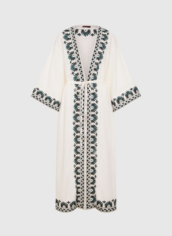 O Kimono é confeccionado em tecido plano com padronagem listrada, possui bordados manuais e maquinetados, decote em "V', mangas amplas 7/8, fechamento por cordão para amarração, comprimento midi e acabamento pespontado.