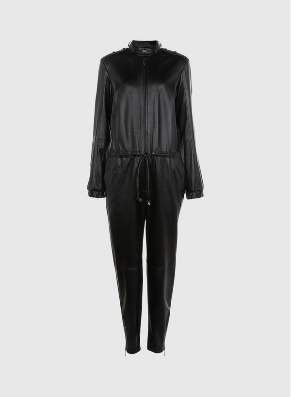 Confeccionado em couro italiano, possui caimento reto, gola padre com passantes, fechamento com botão de pressão, fechamento frontal por zíper, amarração na cintura para ajuste em couro, bolso frontal modelo faca, bolso posterior fake, abertura por zíper na barra e comprimento longo.